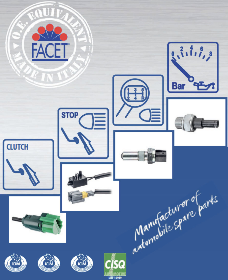 FACET, since 1946, designs, produces and distributes automobile parts, regarding Thermal Management, Switches, Exhaust Gas Management, Sensors and Ignition; being one of the most complete ranges on the market, with especially high coverage of European, Japanese and Korean brands.